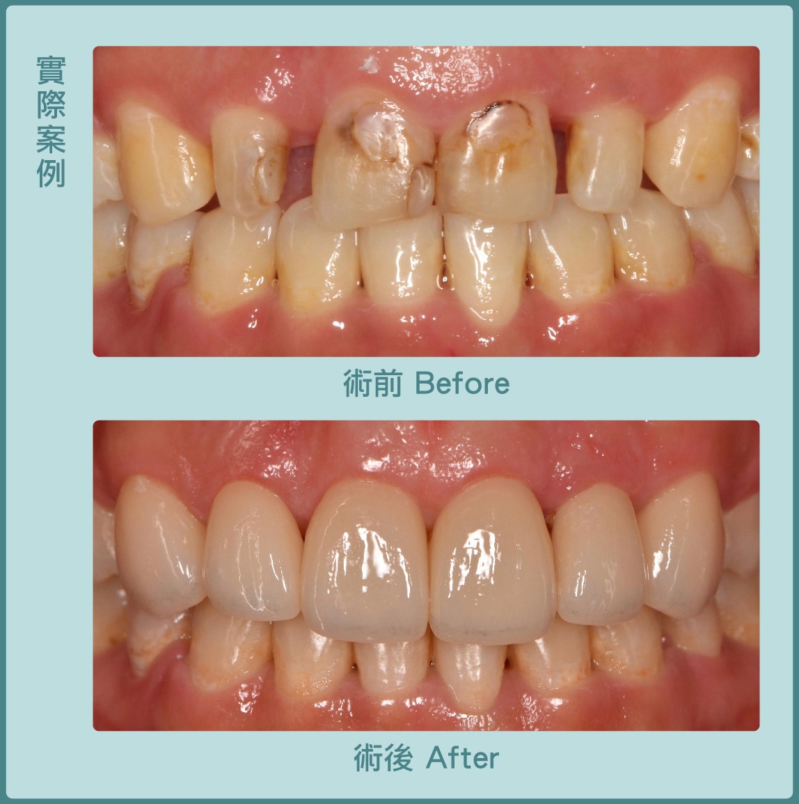 若是牙齒因缺損或是斷裂至牙齦下,導致無法直接修復的狀況,考慮面向要更多。單純牙齦過多,可直接運用雷射把過多的牙齦去除;但是合併齒槽骨異常時,就須以牙周手術修整齒槽骨。先透過 牙周翻瓣手術 讓牙周恢復健康狀態,再用全瓷技術改善美觀問題。通常前牙要做假牙或全瓷貼片,會先裝戴臨時假牙觀察三到六個月,待牙周完全穩定後,才會開始製作正式假牙或全瓷貼片。